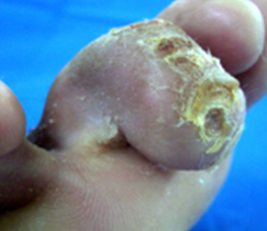 • 당뇨병으로 오랫동안 고생하시는 분들은 많은 수에서 신경장애와 혈액순환 장애가 동반되며 시간이 지나면 신경이 서서히 파괴되어 당뇨병성 신경증이 발생하여 발이 시리거나 저리고 화끈거리는 증세를 호소하며 곧이어 혈액순환장애로 인하여 혈관이 점점 막히게 되어 발이 썩게 됩니다. 이런 상태에서 상처가 생기거나, 또는 발가락 사이가 짖물려 피부가 상하거나, 뜨거운 물이나 방바닥에 닿아 화상을 입거나 물집이 생기면 쉽게 감염으로 진행되고, 잘 치료가되지 않아 절단 할 수밖에 없는 상황에 처하게 됩니다.